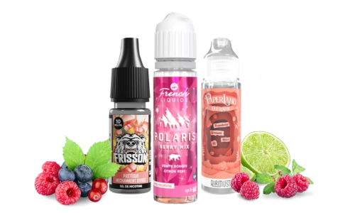 Un e-liquide saveur fruitée propose des arômes de fruits frais, exotiques ou rouges (fraise, mangue, citron, etc.) pour une vape sucrée et rafraîchissante.